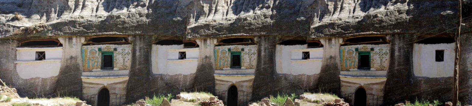 Wir lassen es gemütlich angehen und beginnen mit der Besichtigung der Felsenkirche Medham Alem Adkesho. Der Aufstieg ist kurz und steil, in den Fels getretene Fußabdrücke bieten Halt. Die Kirche ist komplett in einen Felsen gebaut, der Eingang bunt bemalt, gerade findet eine Messe statt. Langsam gewöhnen sich die Augen an das Dunkel in der Kirche. Betende liegen – kaum sichtbar – regungslos am Boden. Vorsichtig bewegen wir uns an den Wandmalereien entlang, die durch das Licht einer kleinen Fackel erhellt werden.