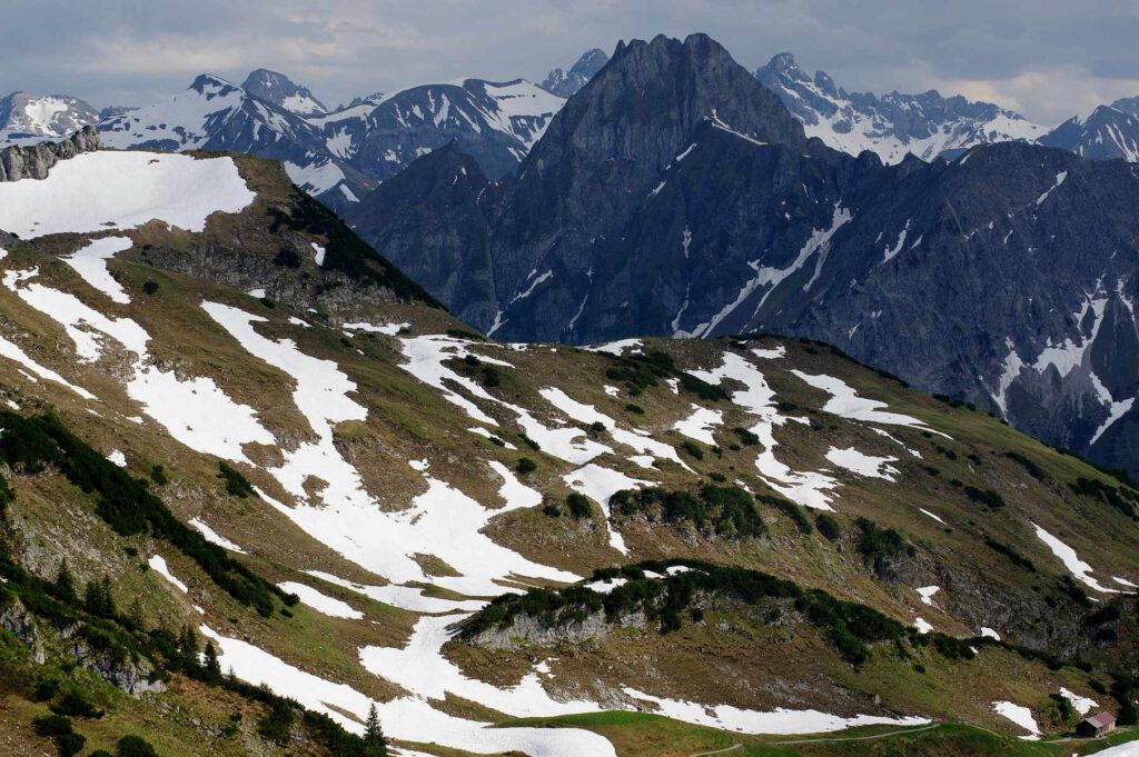 Die Knappenhäuser tauchen auf. Sie sind stille Relikte des Erzbergbaus auf 1.526 Metern. Von hier werfen wir nochmal einen wehmütigen Blick zurück auf grüne Hänge, weiße Schneefelder und graue Felswände, bevor der Weg weiter anzieht.