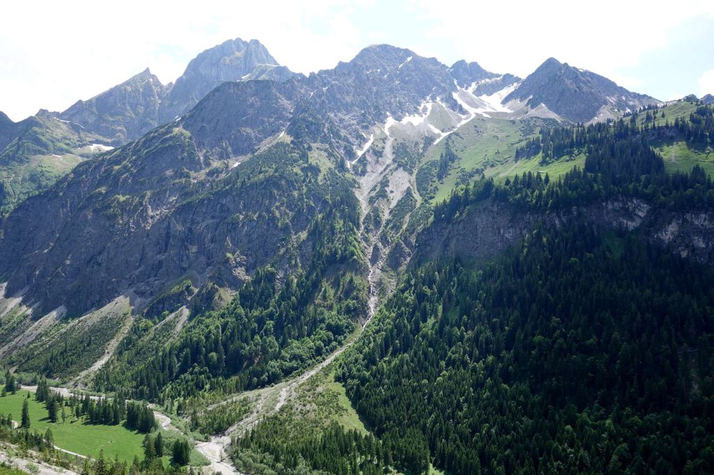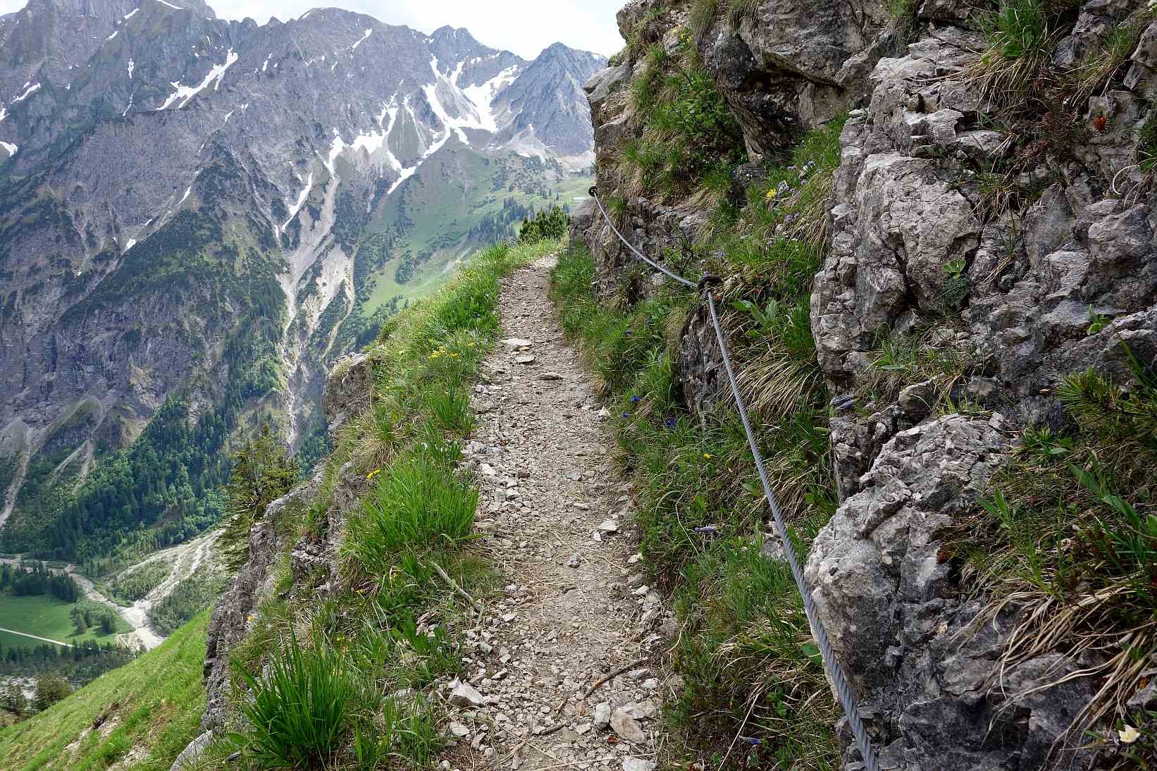 Immerhin: Die Suppe wärmt, der Kuchen tröstet, und wir schlagen gestärkt den Weg zum Hupfleitenjoch ein. Anfangs noch durch ein nettes Wäldchen, dann über glitschige Steine und mit Drahtseilen gesichert an der steil abfallenden Felswand entlang. Dennoch ist der Pfad angenehm zu gehen. Jedenfalls sofern man den Abgrund neben sich eher als landschaftliches Accessoire denn als Bedrohung begreift. Die Aussicht ist spektakulär. Ein Panorama wie gemalt, vermutlich von jemandem, der gleichzeitig für Tourismusplakate und Postkartenverlage arbeitet.