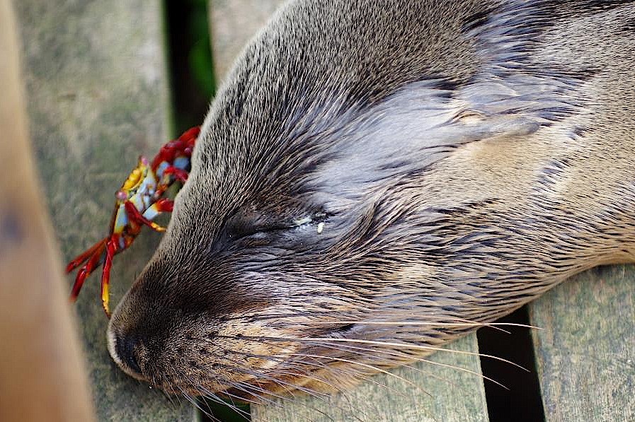 Am Pier von Santa Cruz kontrollieren Ranger die Schuhe nach Sandresten, um das empfindliche Ökosystem der nächsten Insel zu schützen. Während wir auf die Abfahrt warten, setzt sich Marc auf eine Bank. Plötzlich springt eine Seelöwin neben ihn, grunzt und schubst ihn kurzerhand herunter. Ihr Baby rollt sich derweil zufrieden unter der Bank zusammen.
