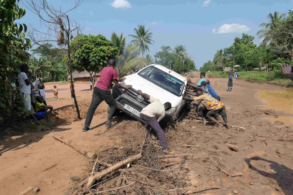 Trotzdem versucht es der Fahrer und gibt Vollgas. Das Auto kippt weiter, die Räder graben sich tiefer ein, die Antriebswelle rotiert auf dem harten Lehmboden. Nun schaufeln ein paar Männer den Schlamm mit bloßen Händen von den Reifen weg, werfen ihn aber nur hinter sich, sodass er sofort wieder nachrutscht. Wieder gibt der Fahrer Vollgas. Diesmal im Rückwärtsgang, während einige Helfer gleichzeitig versuchen, das Auto nach vorne zu schieben. Wieder neigt sich der Wagen noch weiter zur Seite und sinken die Räder noch tiefer in den Morast ein.