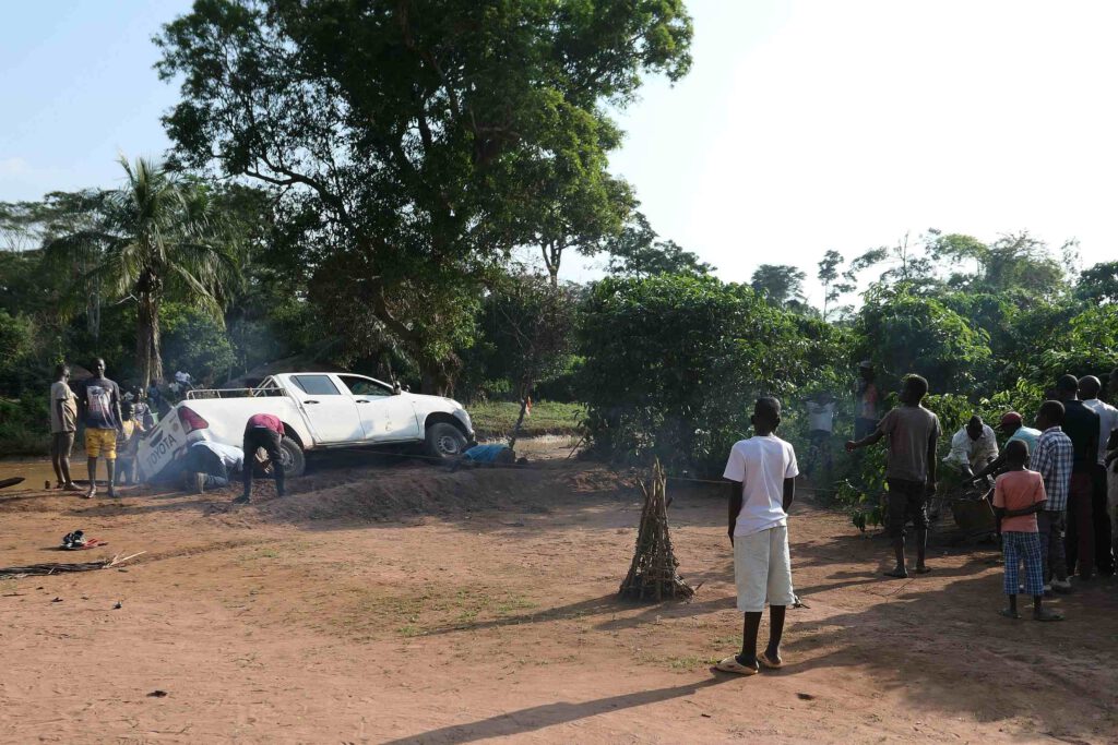 Die Straße ist in einem furchtbar schlechten Zustand. So dauert es auch nicht lange und das Auto steckt wieder fest. Diesmal mit beiden linken Rädern und in bedrohlicher Schieflage im Schlamm einer großen Wasserlache, während die rechten Räder in der Luft hängen. Wir klettern aus dem Fahrzeug. Sofort versammelt sich eine Gruppe Dorfbewohner und diskutiert lautstark. Dabei ist auf den ersten Blick klar, dass der Pick-up nicht ohne maschinelle Hilfe aus dem Morast gezogen werden kann.