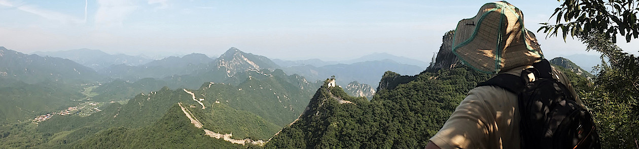 Steil geht es aufwärts zum „Wachturm des hochfliegenden Adlers“, der auf dem höchsten Teil von Jiankou erbaut wurde. Weil Pflanzen ein undurchdringliches Gestrüpp bilden, balancieren wir auf dem Gesims und blicken auf besonders eindrucksvolle Teile der Mauer wie den Pekingknoten, an dem drei verschiedene Abschnitte zusammenlaufen.