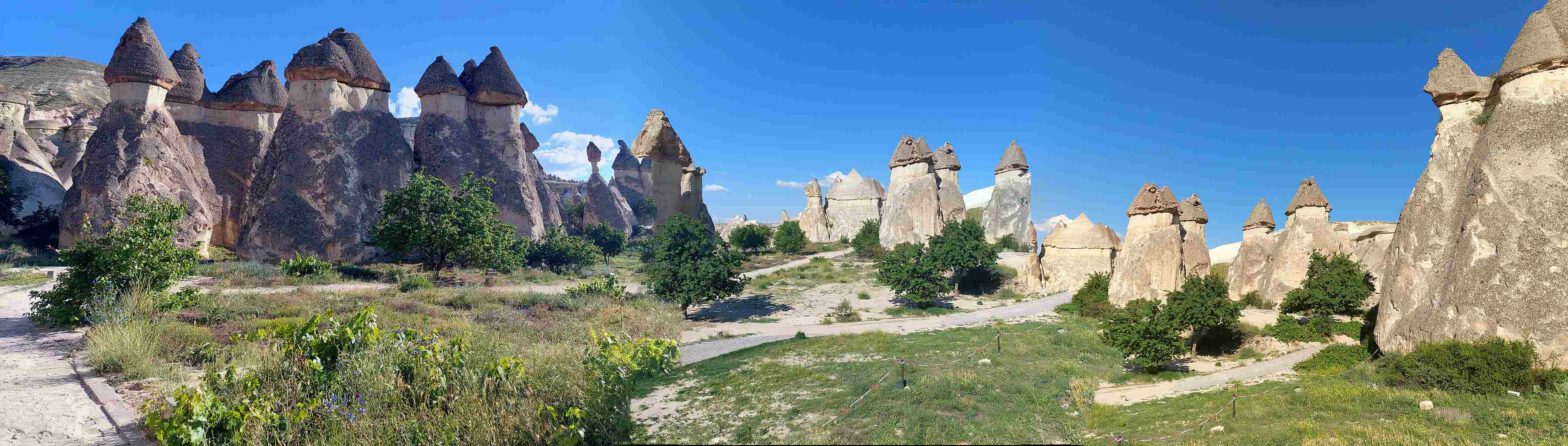 Zwei kurze Wanderungen durch das Rote Tal sowie das Pasabagi-Tal bilden den Abschluss der Reise durch die einmalige Landschaft. Während im roten Tal rosafarbene Tuffkegel dominieren, stehen im Pasabagi-Tal die höchsten und imposantesten Feenkamine. Wir wandeln entlang der Felsriesen, auf dessen Gipfeln pilzförmige Spitzen stehen. In einem frei stehenden Kegel hat sich die Gendarmerie einquartiert.