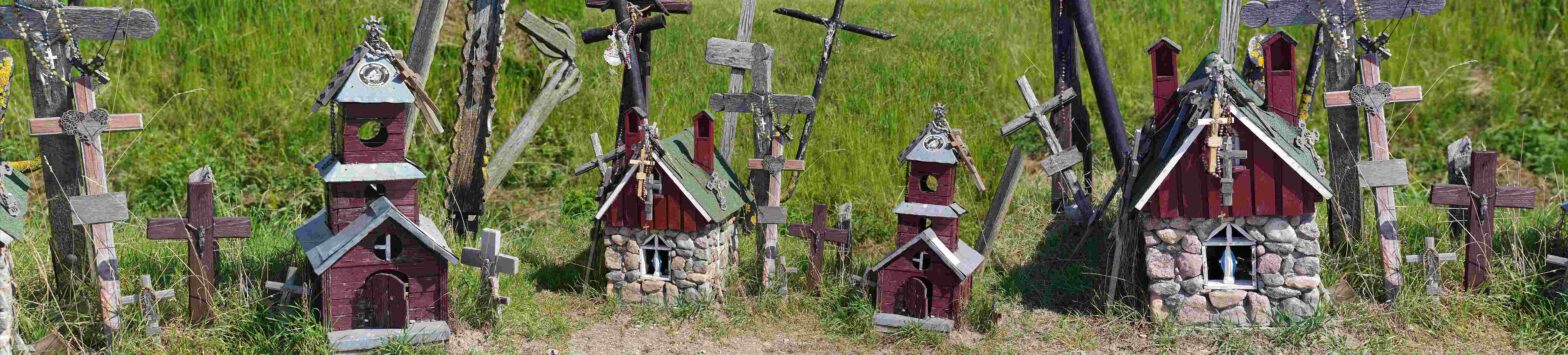 Kurz bevor wir die Stadt Šiauliai erreichen, weist ein Schild auf den Berg der Kreuze hin. Wir folgen ihm zu einer neun Meter hohen Anhöhe inmitten von Wiesen. Hunderttausende von Kreuzen in allen Größen, ineinander verkeilt oder aufgestapelt, verteilen sich über die Erhebung und um sie herum. Auf schmalen Pfaden spazieren wir durch den Wallfahrtsort. Meterhoch bis handgroß, schlicht oder aufwendig geschnitzt, stehen die Kruzifixe wild durcheinander. Rosenkränze aus Perlen und Weinkorken verzieren sie. Ein Kreativer hat seinen Zollstock zu einem Kreuz geformt, an einem anderen Kruzifix hängt Firmenwerbung.
