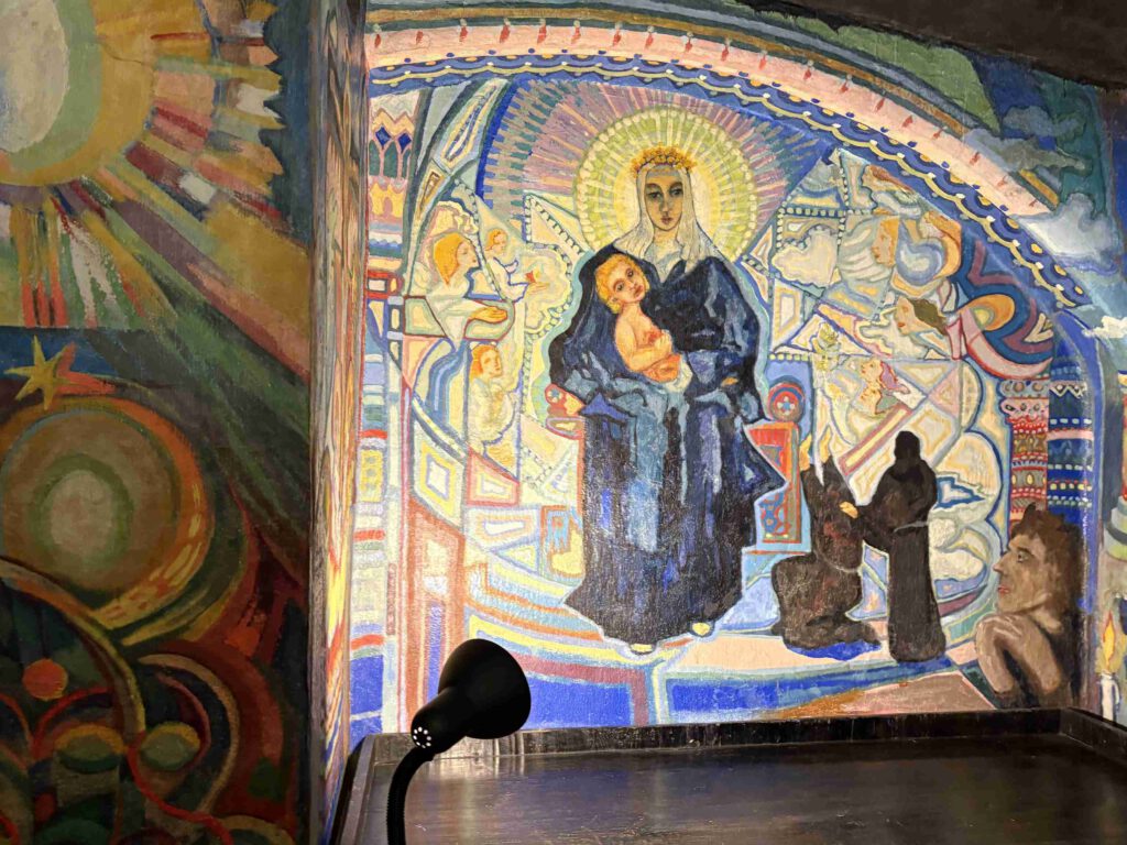 Ein paar Gassen weiter entdecken wir das „Portmoneum“. Der Name täuscht: Hier geht es nicht um Geldbörsen, sondern um den Künstler Josef Váchal, der die Wände, Decken und Möbel seines Freundes Josef Portman mit einer fantastischen Mischung aus mythischen Gestalten, christlichen Symbolen, hinduistischen Motiven und Tierkreiszeichen bemalte.