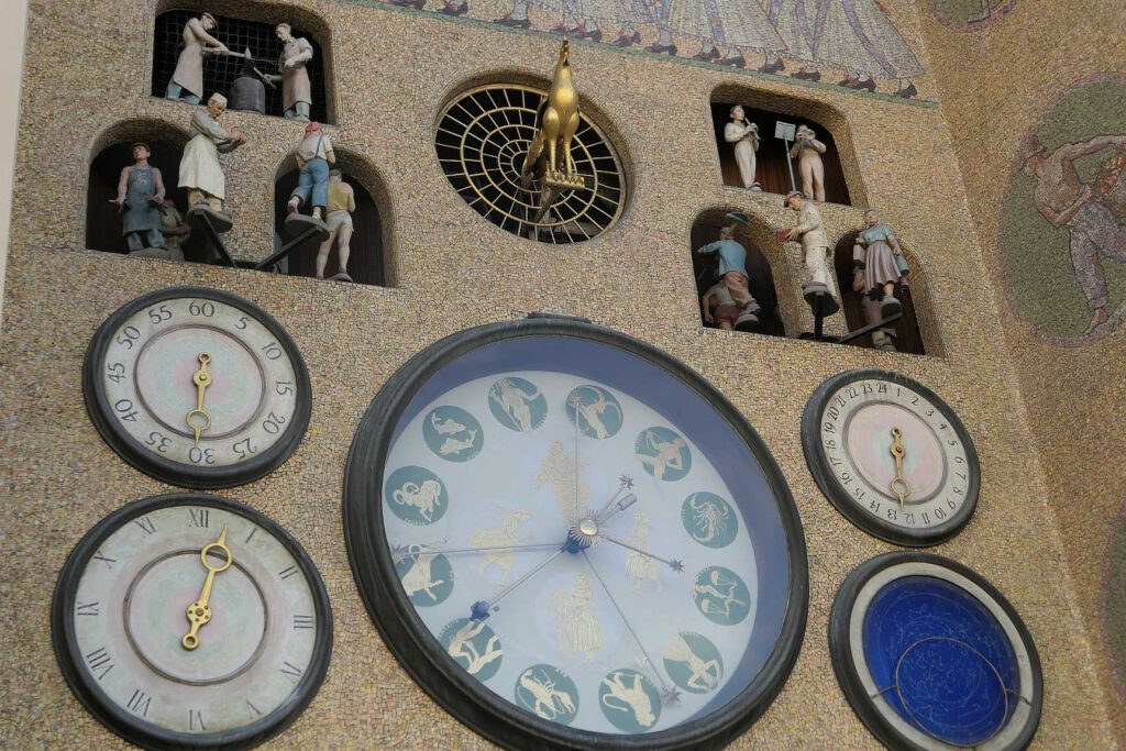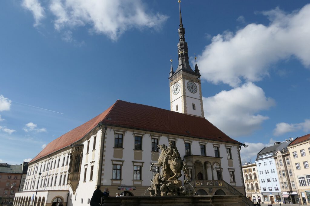 Höhepunkt der Stadt ist die Dreifaltigkeitssäule auf dem Rathausplatz. Leider ist sie bis 2027 wegen Restaurierungsarbeiten eingerüstet, sodass wir unsere Aufmerksamkeit gleich dem Rathaus zuwenden. Zahlreiche Sonnenuhren zieren die Fassaden des Gebäudes, doch die astronomische Uhr zieht uns besonders an. Ihr zartes Glockenspiel zur Mittagszeit geht im Klang der St.-Mauritius-Glocken beinahe unter, doch das eigentliche Schauspiel bietet ihr Design: sozialistische Mosaiken, eine Uhr mit den Geburtstagen von Stalin, Lenin und Klement Gottwald (erster kommunistischer Staatspräsidenten der Tschechoslowakei) sowie Figuren von Arbeitern, Bauern und Intellektuellen, die sich anstelle der Apostel im Kreis drehen.