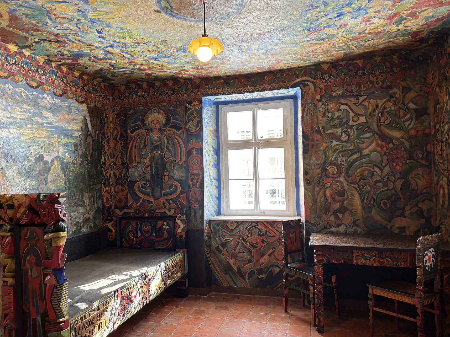 Ein paar Gassen weiter entdecken wir das „Portmoneum“. Der Name täuscht: Hier geht es nicht um Geldbörsen, sondern um den Künstler Josef Váchal, der die Wände, Decken und Möbel seines Freundes Josef Portman mit einer fantastischen Mischung aus mythischen Gestalten, christlichen Symbolen, hinduistischen Motiven und Tierkreiszeichen bemalte.