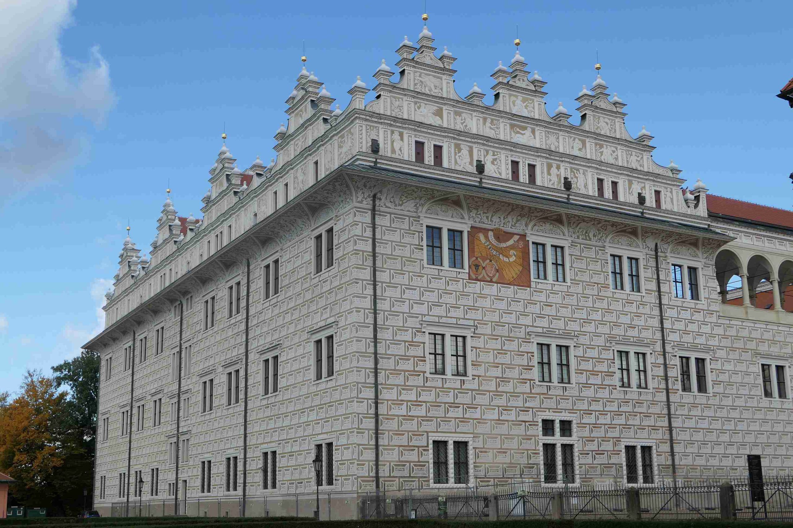 Das Schloss, das wir anschließend besichtigen wollen, ist leider nur im Rahmen einer tschechischen Führung zugänglich, doch die deutsche Übersetzung der Erklärungen in Papierform hilft uns weiter. Die prachtvollen barocken Räume und das historische Theater sind eindrucksvoll, ebenso die kunstvolle Sgraffito-Fassade, die dem Gebäude eine bemerkenswerte räumliche Tiefe verleiht.