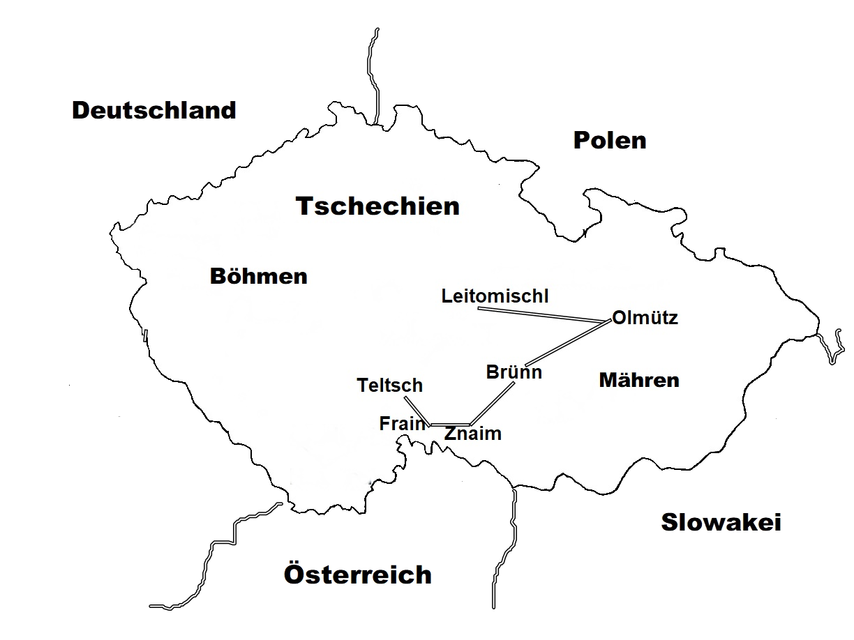 Leitomischl (Litomyšl) – Olmütz (Olomouc) – Brünn (Brno) – Abstecher nach Schloss Eisgrub (Lednice) und Znaim (Znojmo) – Frain (Vranov) – Abstecher nach Teltsch (Telč)