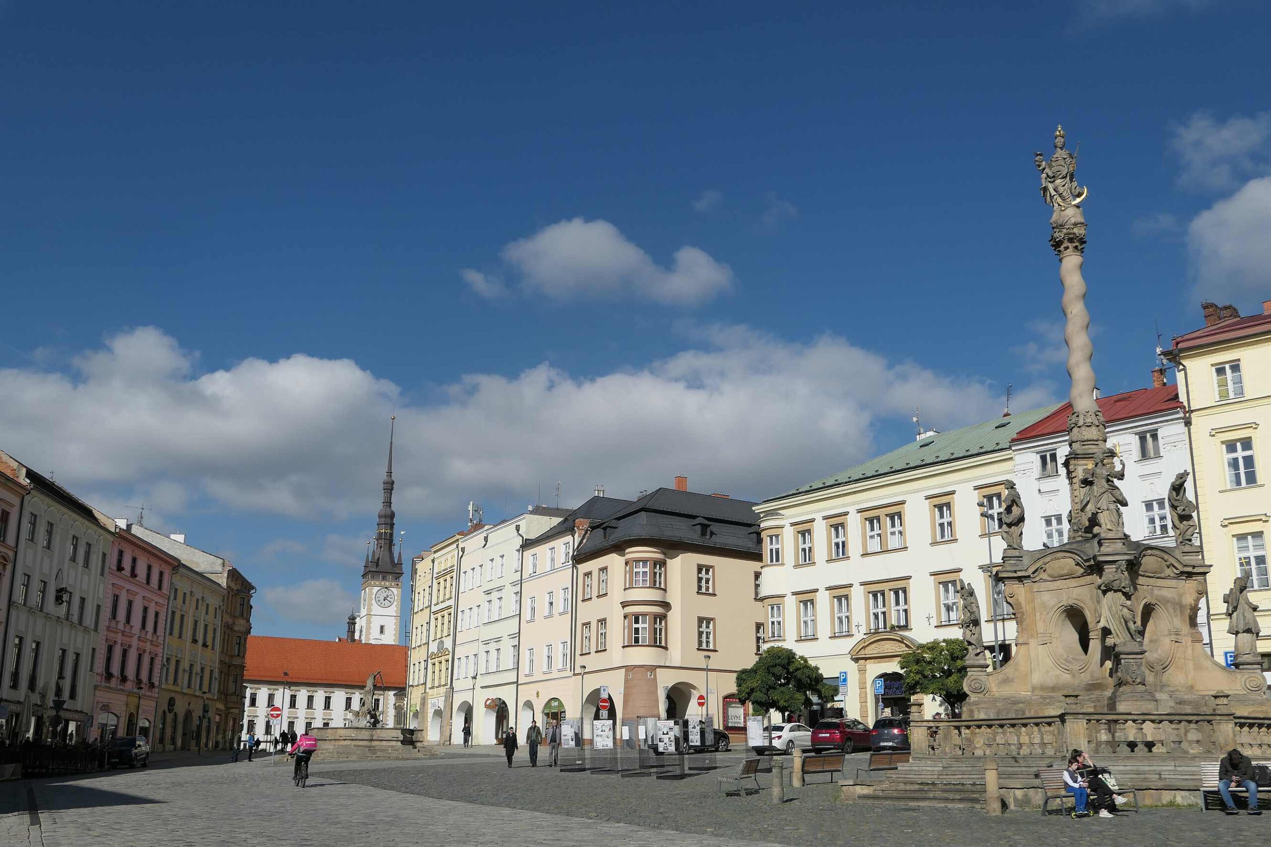Höhepunkt der Stadt ist die Dreifaltigkeitssäule auf dem Rathausplatz. Leider ist sie bis 2027 wegen Restaurierungsarbeiten eingerüstet, sodass wir unsere Aufmerksamkeit gleich dem Rathaus zuwenden. Zahlreiche Sonnenuhren zieren die Fassaden des Gebäudes, doch die astronomische Uhr zieht uns besonders an. Ihr zartes Glockenspiel zur Mittagszeit geht im Klang der St.-Mauritius-Glocken beinahe unter, doch das eigentliche Schauspiel bietet ihr Design: sozialistische Mosaiken, eine Uhr mit den Geburtstagen von Stalin, Lenin und Klement Gottwald (erster kommunistischer Staatspräsidenten der Tschechoslowakei) sowie Figuren von Arbeitern, Bauern und Intellektuellen, die sich anstelle der Apostel im Kreis drehen.