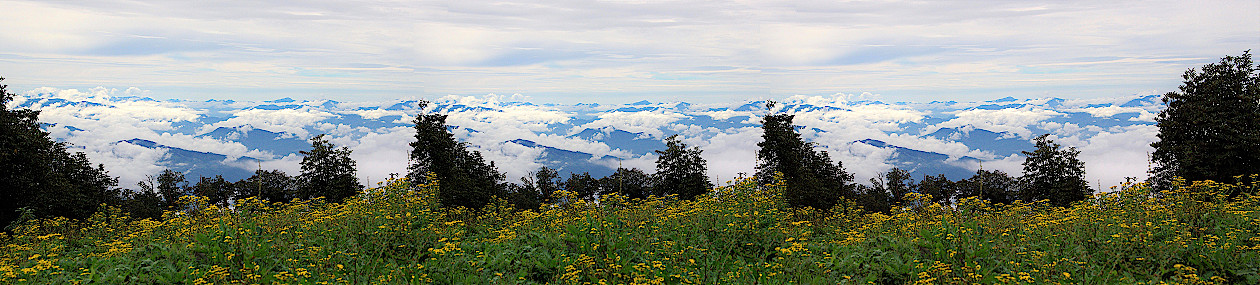 Die Sonne scheint durch die Wolken. Unsere Blicke gehen hinauf zu Bergspitzen, die sich über den Wolken erheben und hinab in tiefe dunkelgrüne Täler. Wasser läuft über die Wege; es ist rutschig.
