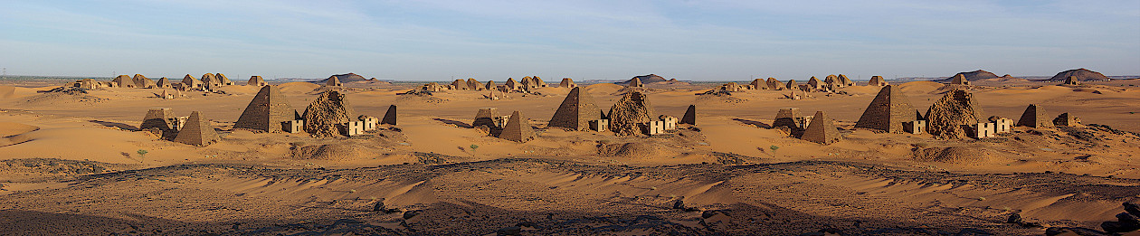 Meroe war die Hauptstadt des Reiches von Kusch. Mehrere Hundert über kleine Hügel verteilte Pyramiden stehen in den Sanddünen, in deren Schutz wir die Zelte aufstellen.