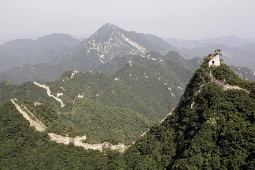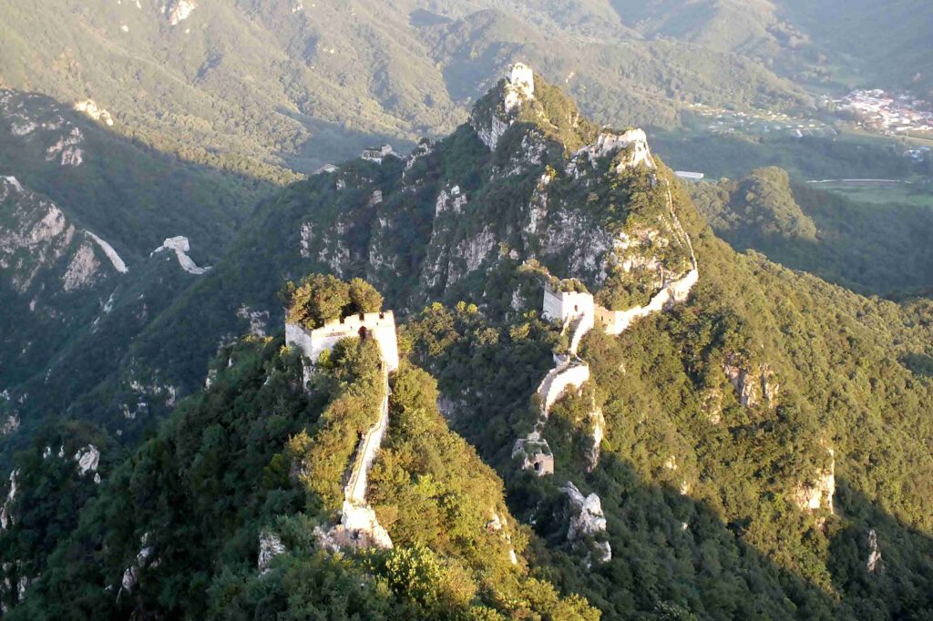 Steil geht es aufwärts zum „Wachturm des hochfliegenden Adlers“, der auf dem höchsten Teil von Jiankou erbaut wurde. Weil Pflanzen ein undurchdringliches Gestrüpp bilden, balancieren wir auf dem Gesims und blicken auf besonders eindrucksvolle Teile der Mauer wie den Pekingknoten, an dem drei verschiedene Abschnitte zusammenlaufen.