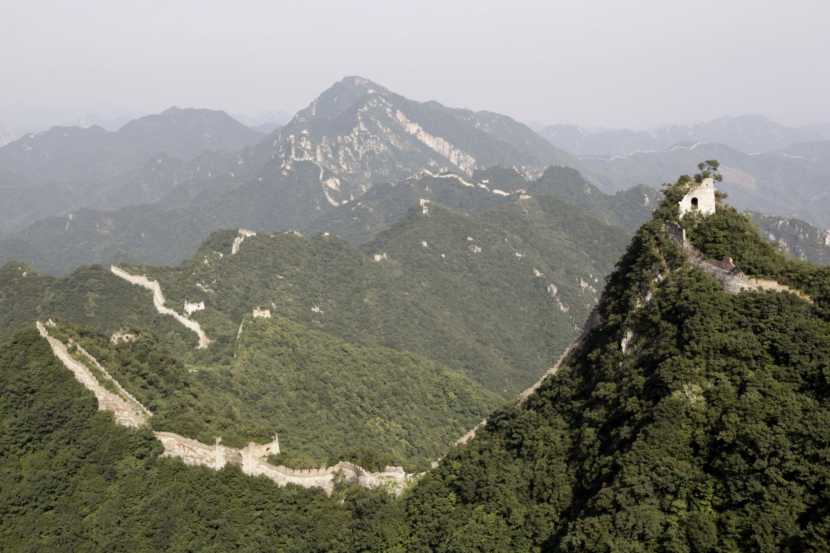 Steil geht es aufwärts zum „Wachturm des hochfliegenden Adlers“, der auf dem höchsten Teil von Jiankou erbaut wurde. Weil Pflanzen ein undurchdringliches Gestrüpp bilden, balancieren wir auf dem Gesims und blicken auf besonders eindrucksvolle Teile der Mauer wie den Pekingknoten, an dem drei verschiedene Abschnitte zusammenlaufen.