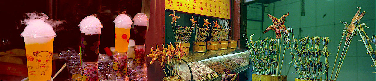 Der Nebel lichtet sich, die Dunkelheit bricht herein. Hungrig fahre ich zur Wangfujing Street. In einer von Touristen überfüllten Seitengasse – der Snack Street – gibt es alles zu kaufen, was an Essbarem in einen chinesischen und meinen Magen passt.