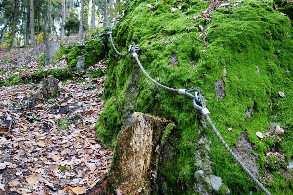 Der Abstieg führt durch das Felsenmassiv der „Mondsteine“. Klingt nach Science-Fiction, sieht aber eher nach Naturkundeunterricht aus; trotzdem ein würdiges Finale für eine Wanderung, die von allem ein bisschen hat: Idylle, Klettern, Geschichte, Humor und kalte Ohren.