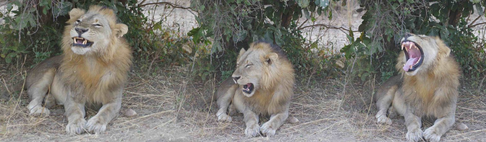 Ein Pavian schreit. Geoffrey zeigt auf den Baum, auf dem der Affe sitzt und konzentriert in eine Richtung blickt: „Das ist ein Alarmruf und seht ihr die Impalas da vorne? Sie blicken in dieselbe Richtung. Ein paar Meter links von ihnen müssen Löwen sein.“ Wir fahren hin und tatsächlich liegen zwei Löwen unter einem Busch. Während der eine im Gras liegend vor sich hin döst, leckt sich der andere die Pfoten, gähnt ausgiebig, sodass wir sein Gebiss bewundern können und macht es sich gemütlich. „Wir kommen um 18 Uhr zurück, dann beginnt die Jagdzeit“, schlägt Geoffrey vor.