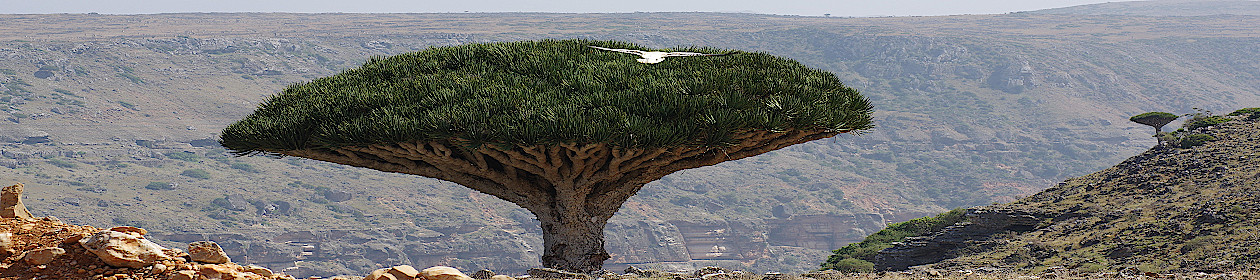 Der Drachenblutbaum ist das Wahrzeichen von Sokotra. Der knorrige Stamm verzweigt sich in Kopfhöhe in dicke Äste, die ein dichtes, pilzartiges, stachliges Blätterdach tragen. Rot wie Blut ist das Harz und bekannt für seine medizinischen Eigenschaften.